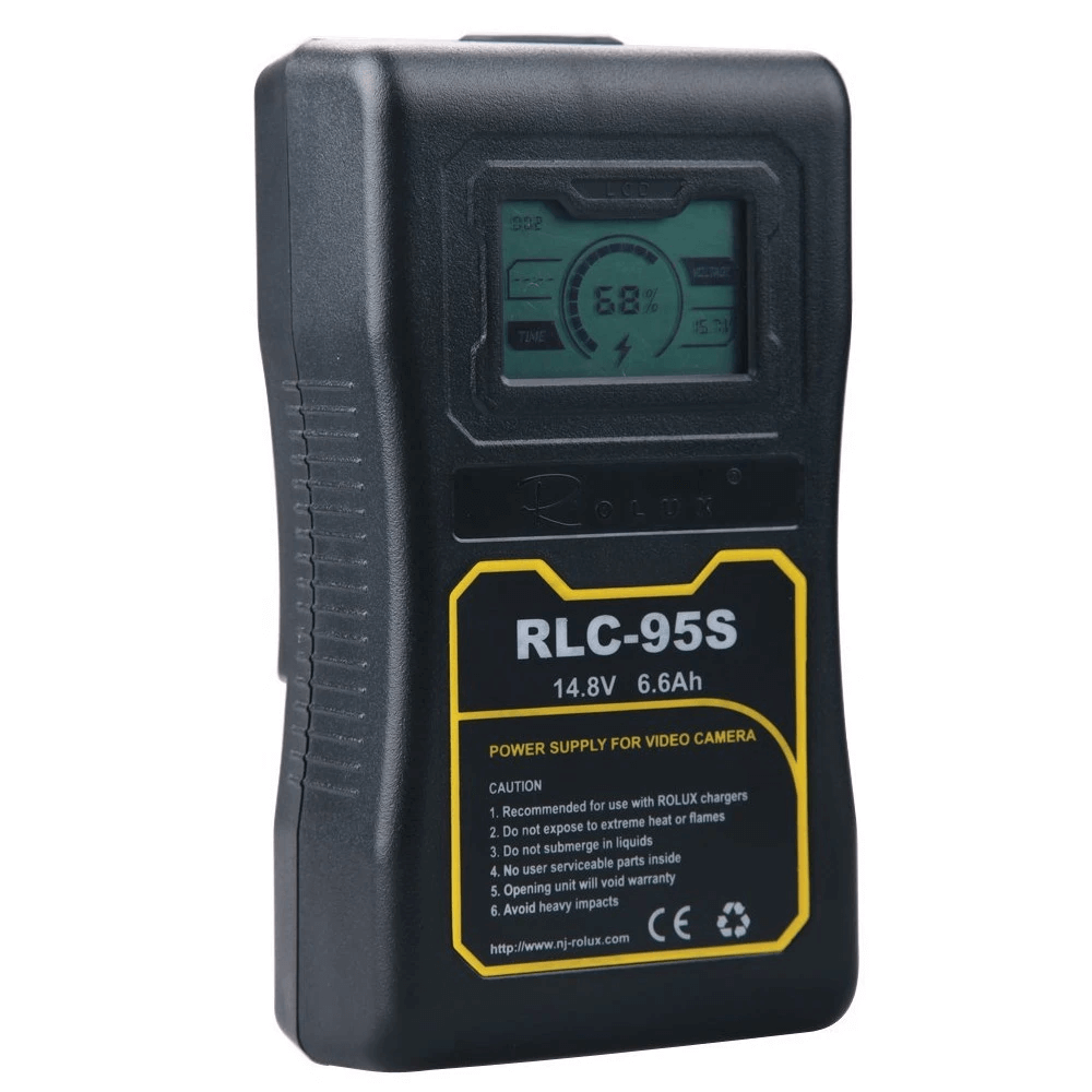 A V-Mount Rolux RLC-95S é compatível com todos os dispositivos elétricos com uma conexão V-Mount, como câmeras de vídeo e Ilumiandores LED. A diferença entre esta bateria V-mount e uma bateria normal é o display LCD que mostra um status detalhado da bateria. Ele exibe difersos detalhes, por exemplo; porcentagem de bateria, ciclos, tempo que leva para carregar uma bateria quando ela está conectada a um carregador e o tempo restante estimado que a bateria.