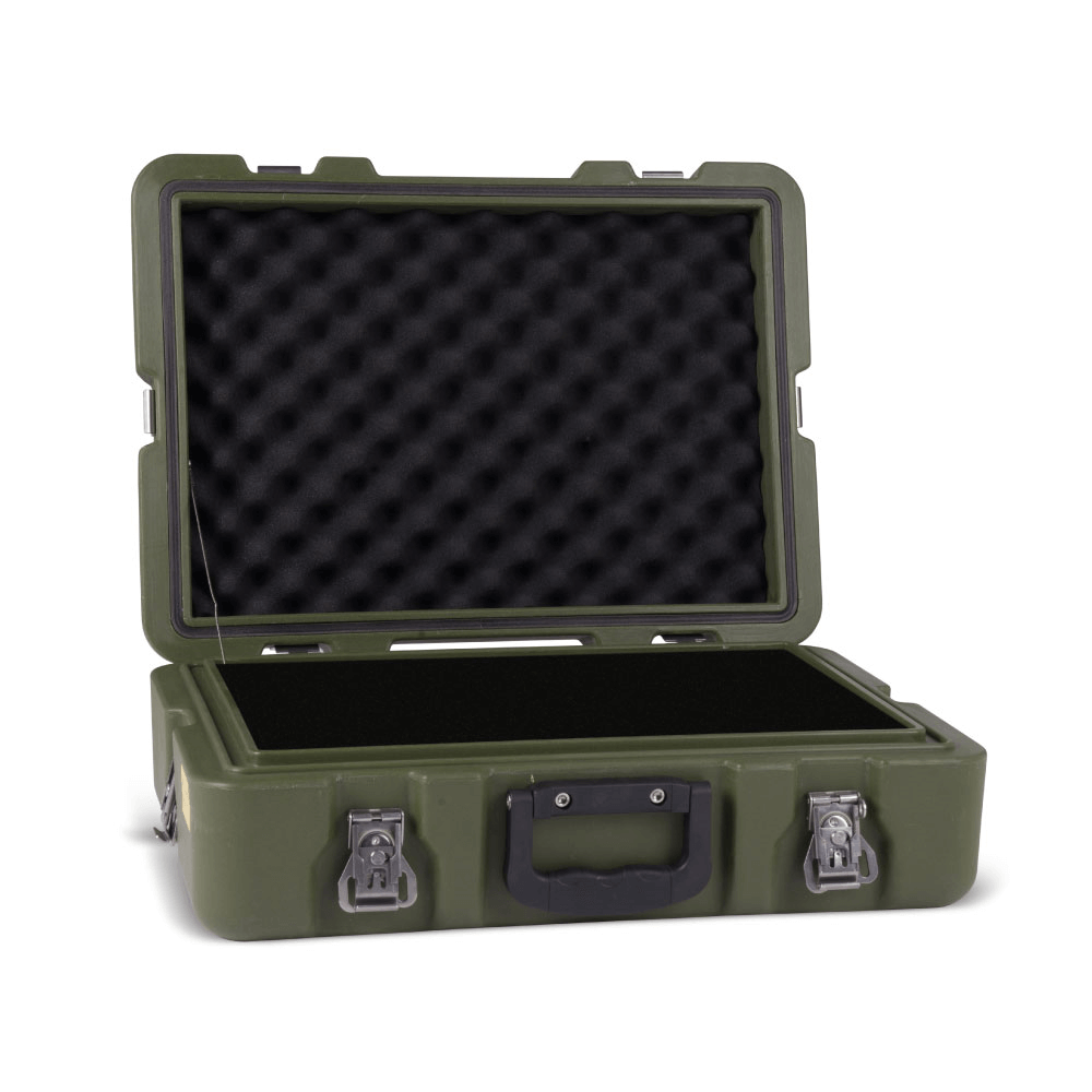 O Case Rígido R422815 de Padrão Militar na cor Verde é feito por Rotomoldagem de polietileno de média e alta densidade com proteção anti-ultravioleta. Feito em à prova d'água, choque, poeira, esmagamento, e sendo hermético é resistente a fungos e à maioria dos produtos químicos e solventes. Moldado em prova de riscos, espessura das paredes uniforme, cantos grossos para maior resistência ao impacto.
