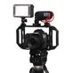 Ideal para Câmeras DSLR, Microfones, Flashes e Iluminadores Suporte de mão lateral e superior espumado Encaixe para Tripés Feito de alumínio |