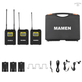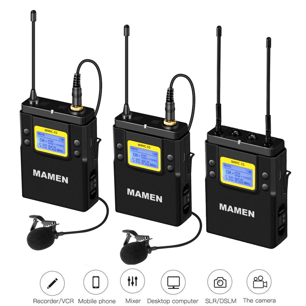 O Sistema Wireless Duplo Microfone Lapela Mamen WMIC-01 Duplo Canal UHF com 2 Transmissores e 1 Receptor P2, com Sapata de Montagem em Câmera, é um Kit Sem Fio Mamen WMIC-01 com dois Microfone Lapela Sem Fio, aonde acompanha Dois Transmissores e um Receptor P2 com 50 Canais com é um por um, um por dois; conexão de dois canais; podendo alcançar uma distância de Transmissão perfeita de 60 metros e possui função de monitoramento em tempo real.