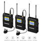 O Sistema Duplo de Microfone Sem Fio UHF WMIC-01 com 2 Transmissores e Lapela p2 destina-se à operação sem fio portátil, como entrevista de notícias, filmagem de filmes e televisão, entrevista de personagens, hospedagem de programas, ensino e treinamento e outros aplicativos de gravação de vídeo / som. Este pacote inclui um receptor e um transmissor.
