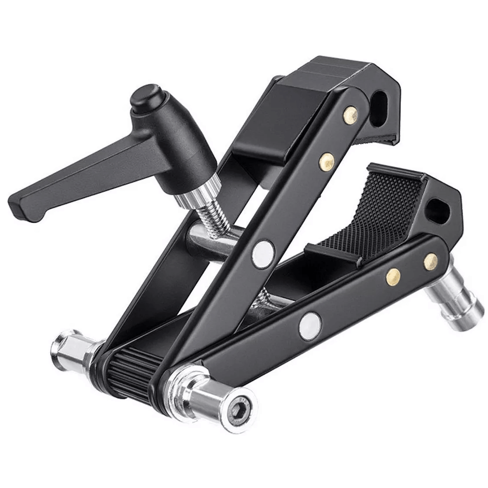 Suporte de braçadeira para Câmera e Iluminadores suporta equipamentos de até 12Kg e possui 1x interface de 1/4" e 3x interfaces de montagem padrão de 5/8", que pode ser conectado a vários acessórios de equipamentos fotográficos. Seu clipe de alicate antiderrapante pode ser firmemente fixado mesmo em uma superfície lisa. Além de possui abertura máxima de fixação é de 10cm e mínima de 2cm.
