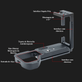 Na parte superior do Suporte L-Bracket possui entrada de Sapata Fria reversível e 4x entradas 1/4"-20 para montagem de Microfone, Luz Led, entre outros acessórios. Em sua parte inferior possui diversas 6x entrada de rosca 1/4"-20 e 1x 3/8"-20 para montagens em tripés e monopés, além de acompanhas uma Bucha Redutora 1/4" para 3/8". Na parte Lateral possui ranhura em cauda tipo Arca-Swiss em uma Cabeça de Tripe compatível para montagem de disparo vertical, e ainda base do Suporte pode se estender até 3cm para permitir o acesso aos cabos.