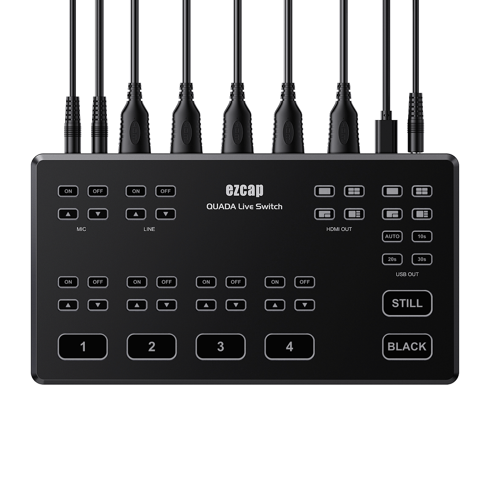 Oferecendo duas entradas independentes de áudio estéreo de 3,5mm, o Switcher Ezcap 328 HDMI permite conectar fone de ouvido, microfone de lapela ou até um reprodutor de música para gerar música de introdução após o início da transmissão ao vivo. As entradas de áudio do Ezcap328 QUADA Live Switch incluem botões no painel para ajustar o nível de áudio. Além disso, possui também mixer de áudio integrado nas entradas HDMI, e as entradas de microfone e linha estão todas conectadas ao mixer de áudio para que você possa mixar ao vivo de todas as fontes de áudio.